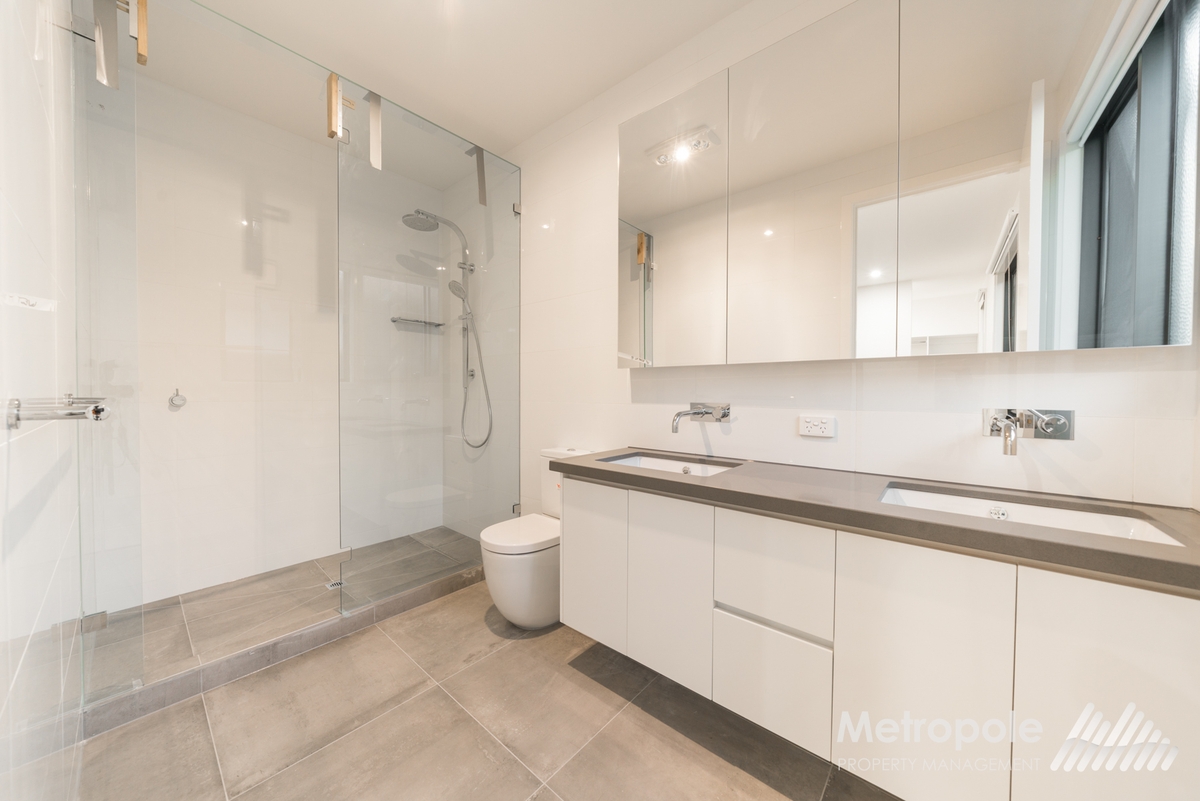 - Ensuite bathroom with quality AXA double basin vanity and tap wear, mirrored cabinetry, full length shower with twin rainfall shower heads, floor to ceiling porcelain tiles