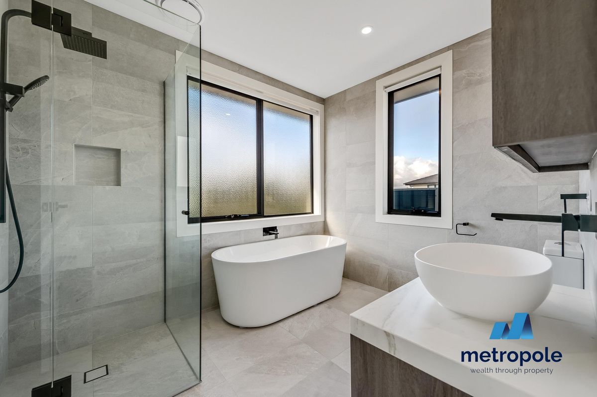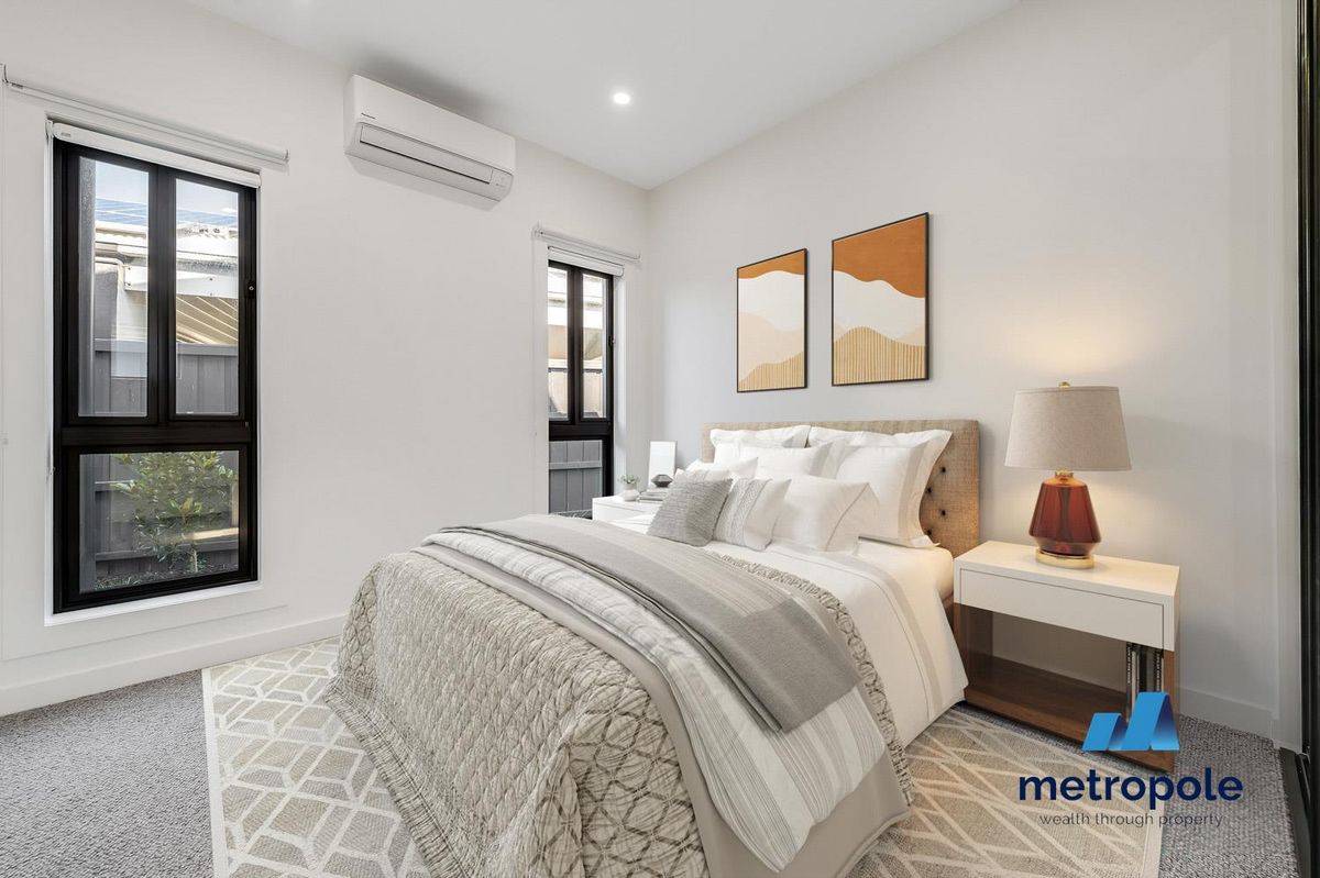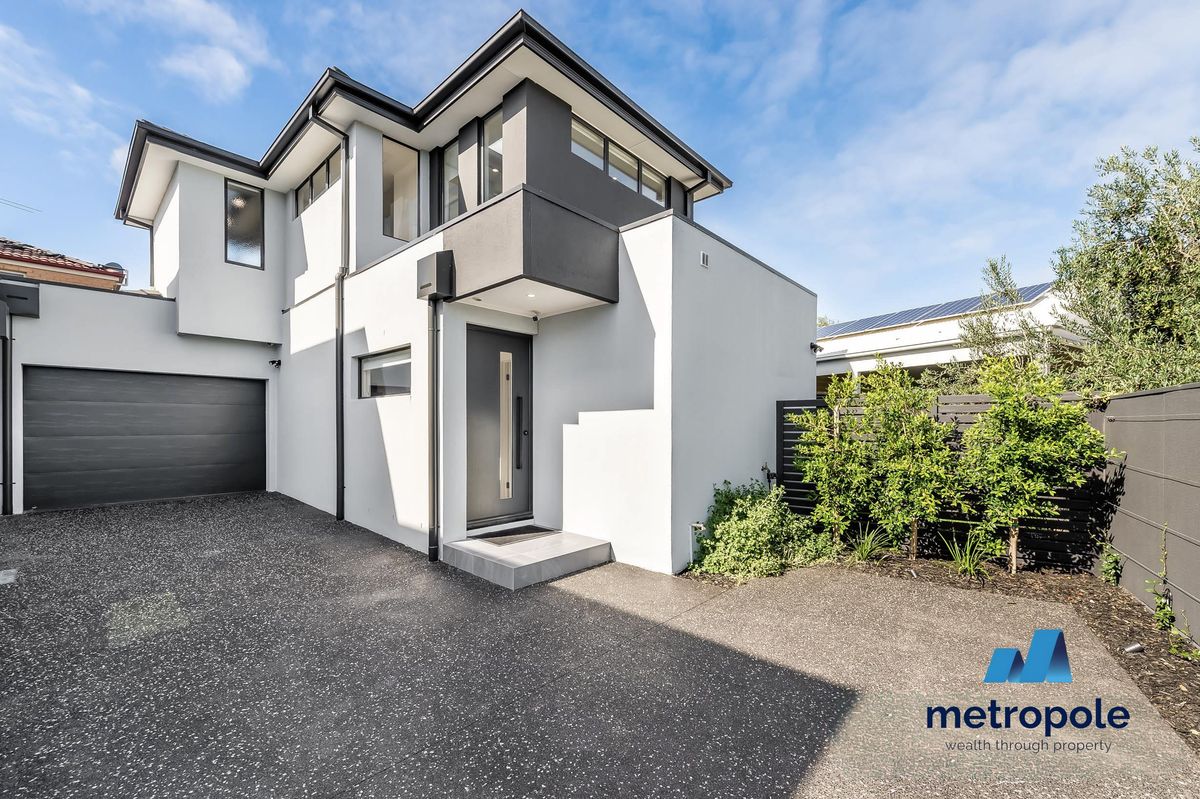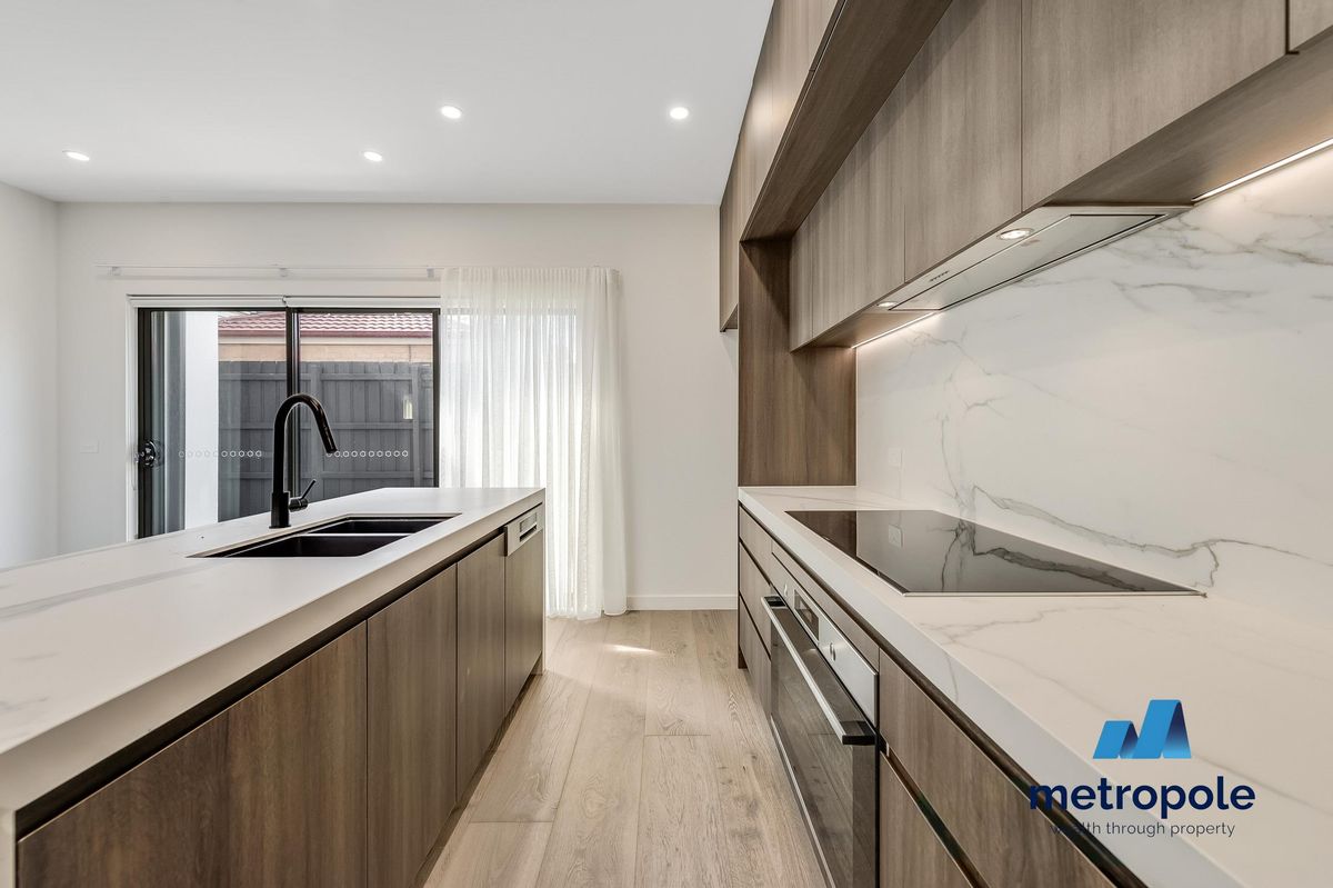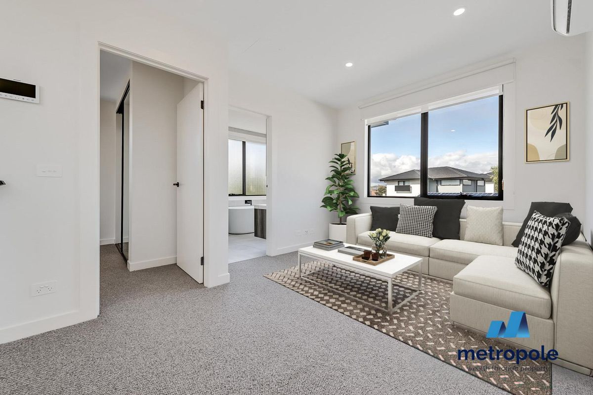 The ground-floor main bedroom features a sublime en-suite and built-in robes, while the two additional robed bedrooms upstairs are accompanied by two chic bathrooms and a second living room. Other high-end features of this home include floor-to-ceiling tiles in the bathrooms, internal access from the single remote garage, double glazed windows and doors, security cameras, automatic security gates with intercom, and split system heating and cooling in every bedroom and living room for added comfort.